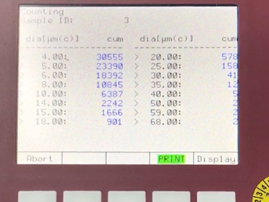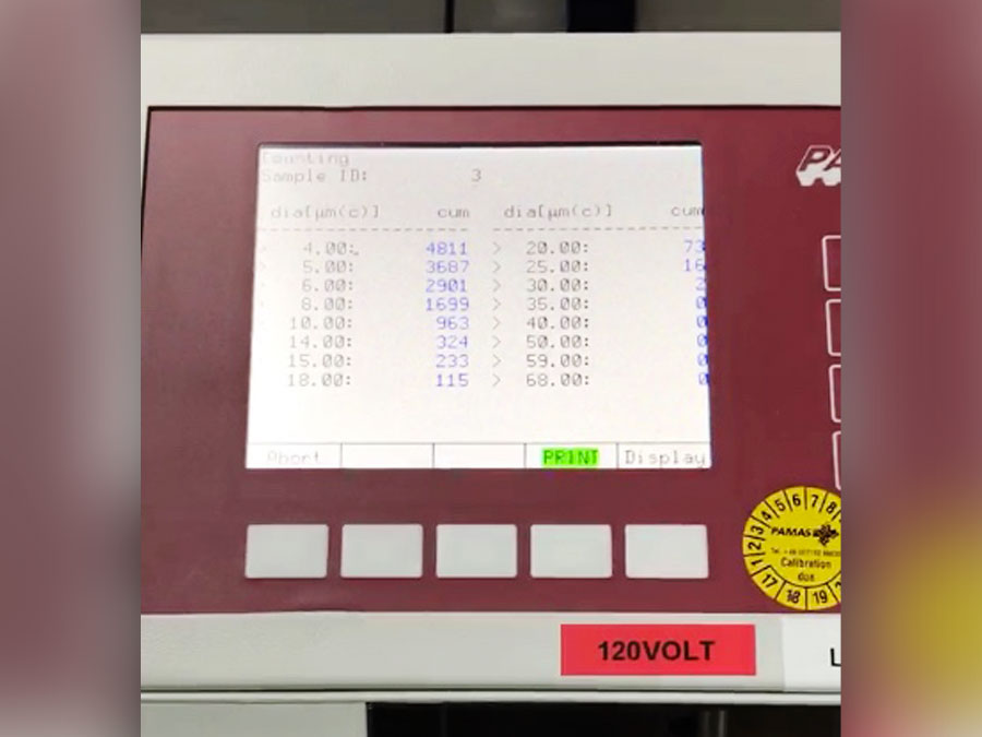 Se procedió a filtrar el fluido por debajo de <9<8<7, y se tomó la muestra pasando por el contador. La sorpresa fué que a pesar de haber repetido el procedimiento 3 veces procurando limpiar lo más posible los otros equipos, nunca podimos obtener mediciones por debajo de 16/14/12; siendo un 19/17/13 la media de las resultantes del primer procedimiento de medición.
