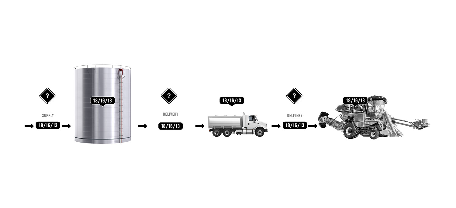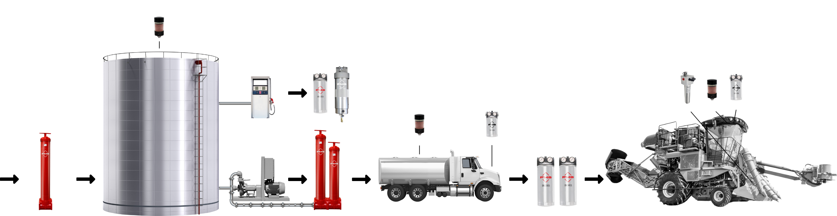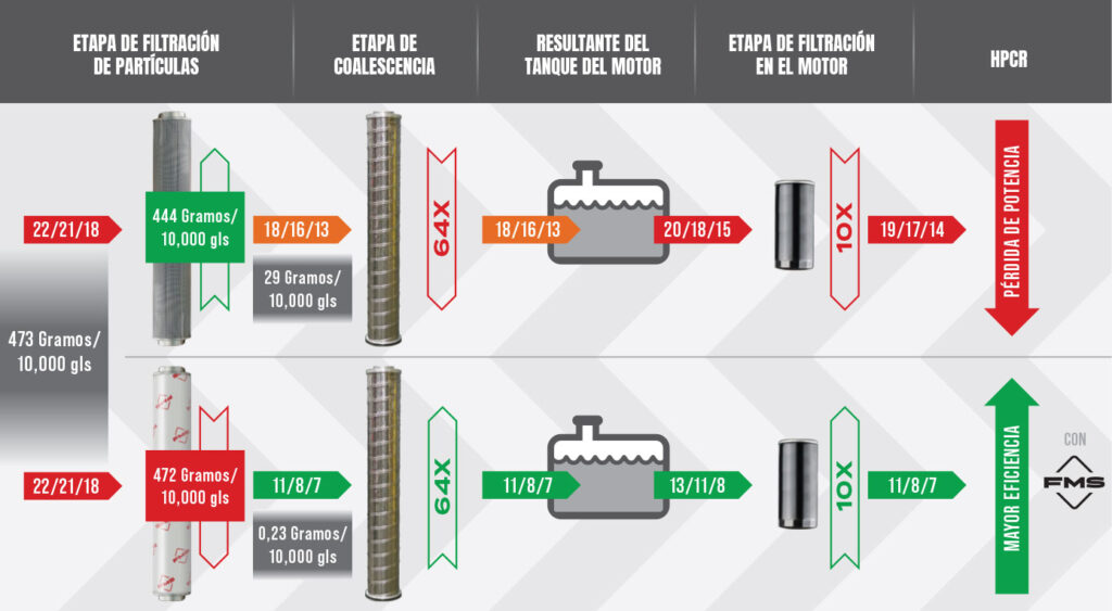 A água e as emulsões são responsáveis por até 15% da perda de potência, e consequentemente, por até 15% de aumento no consumo de combustível. Todo plano de controle de contaminação ISO 4406 deve contemplar a água e emulsões com sistemas certificados SAE J1488.